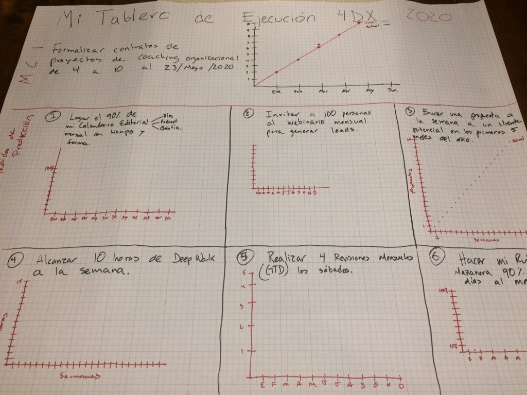 Las Metas Crucialmente Importantes, las Medidas de Predicción, junto con el Tablero de Resultados y la Cadencia de Rendición de Cuentas son las “4 Disciplinas de la Ejecución” (4DX) propuestas por Sean Covey, Chris McChesney, Jim Huling y José Gabriel Miralles que te recomiendo leerlo para este 2020.